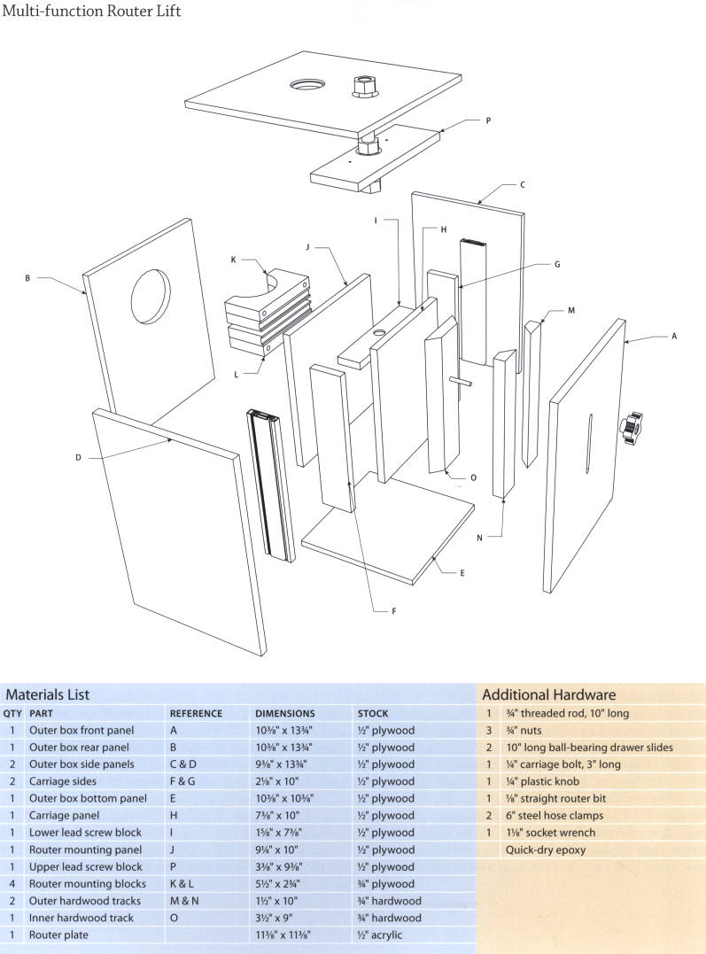 Because the router switch is inside the box, you will want to purchase an external switch, perhaps with a variablespeed dial. I suggest slipping a piece of straight steel rod into the router collet (1/2″ or 1/4″, depending on your router) and using a square on top of the plate to make sure it is perpendicular in all directions. You can adjust the router mounting blocks, or shim under the corners of the router plate to fine tune it. If your hardwood track is too tight, you will have to reposition the two singlebeveled blocks, which is why we didn’t glue them down. Install a knob onto the carriage bolt protruding from the slot in the front of the lift. This is your locking mechanism to secure the lift during use.